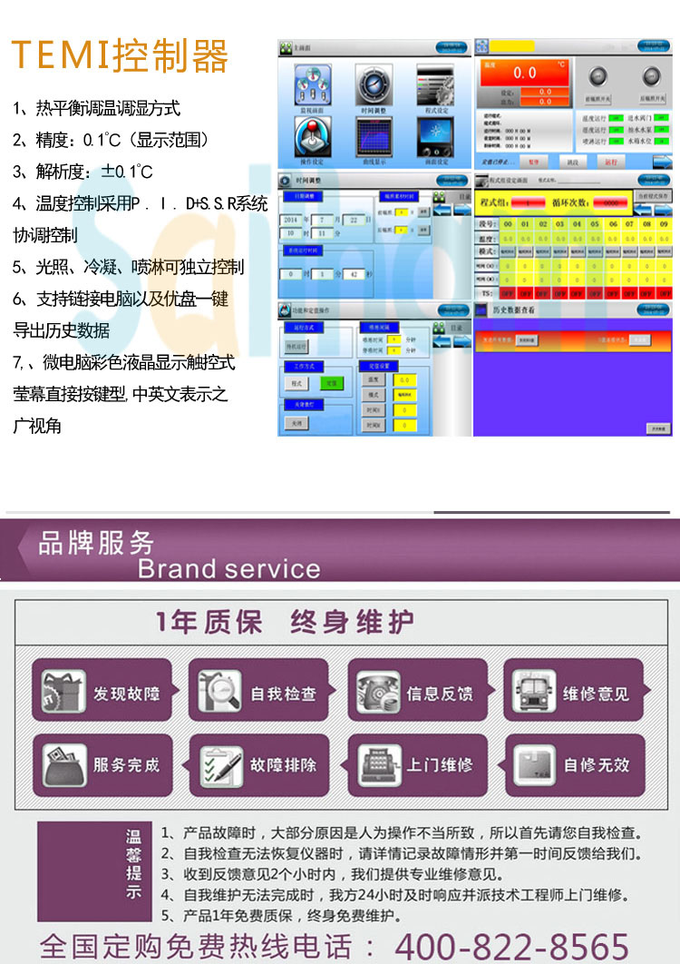 紫外線老化測試機保養(yǎng)及維護1.隨時保持外觀整潔。2.本機頂蓋上請勿放置物品以利馬達及控制零件之散熱。3.若測試物含塵量多時,請視情況清理內部風車室風輪之出風量。4.請經常檢查機臺之固定螺絲是否松動,請固定之。5.請貴公司維護保全人員,